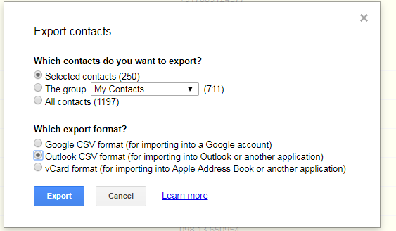 It will ask you if you want to export to a Google csv, Outlook csv or vCard. Select Outlook csv and click ‘Export’.