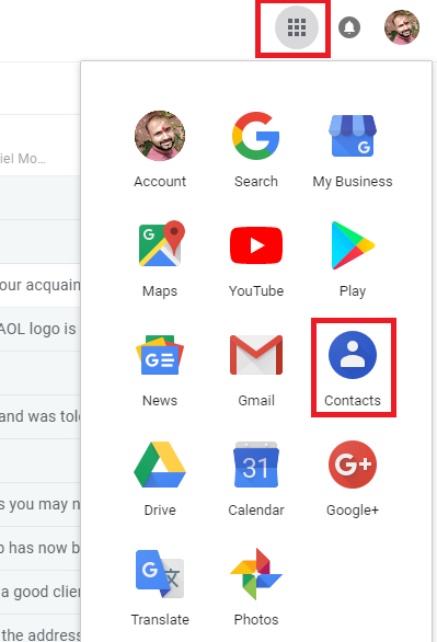 Click on Gmail from the Top Left Corner and then choose Contacts.