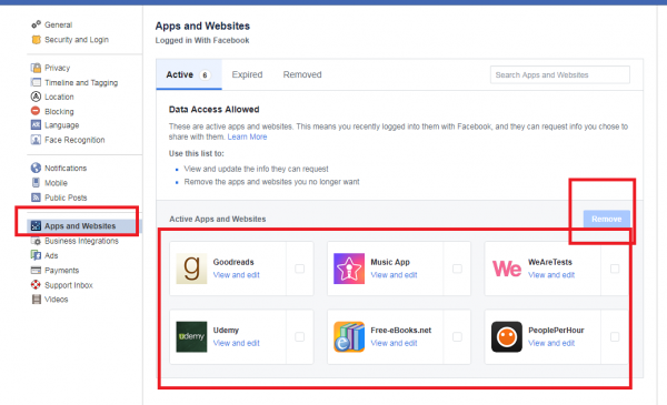 Under ‘Apps and Websites’ you’ll see a list of active, expired and removed links to games and sites. From here you can see the apps that have accessed your data and if necessary, remove or clear permissions for apps or sites that you no longer use.
