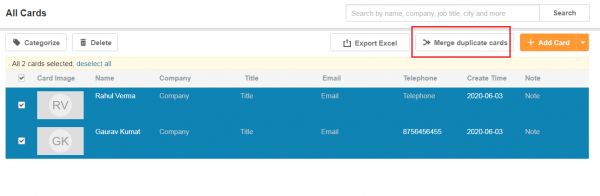 - Click the merge icon in upper right to merge duplicate cards.