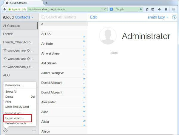 Click on the gear icon (left hand corner of screen) and select export vCard.