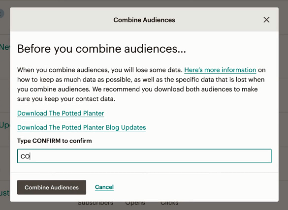 As a caution, remember that once you’ve merged the 2 audiences, some data characteristic or the New Audience before merging such as Click through rates, open rates, etc. will be lost forever.