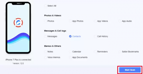 Select “Contacts” and click on the “Start Scan” icon.