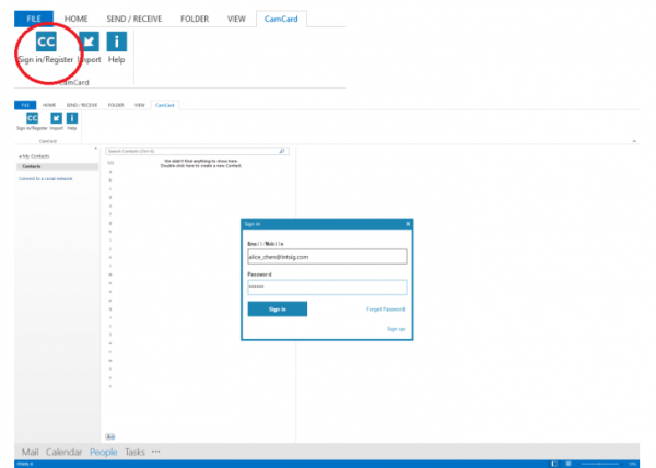 Then open Outlook and click the CC icon on the upper left corner to sign in to your CamCard Business account. After signing in, all card information will be automatically exported to your Outlook contacts.