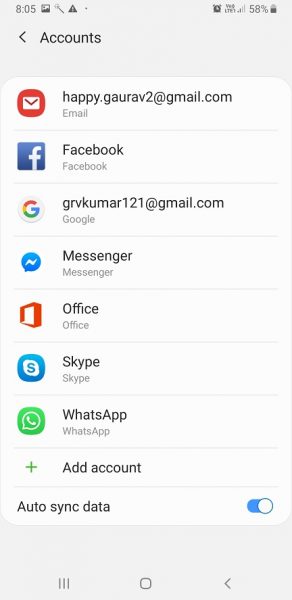 Go to the Settings app on your Android phone and Select Accounts & Sync. For some devices, this option might be “Accounts” or “Account & Backup” only instead of Accounts & sync.