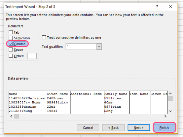 You’ll notice that Excel will import a whole host of columns – up to around 160 of them.