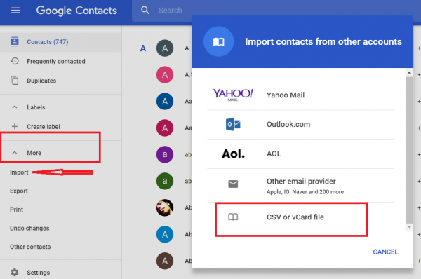 - In the lefthand sidebar you will find ‘import contacts’. You may need to click on ‘more’ if it isn’t showing.