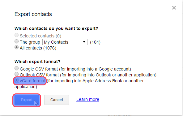 Step 4: Now you could choose either all contacts or selected groups of contacts to export from Gmail, and choose “vCard format” as the export format.